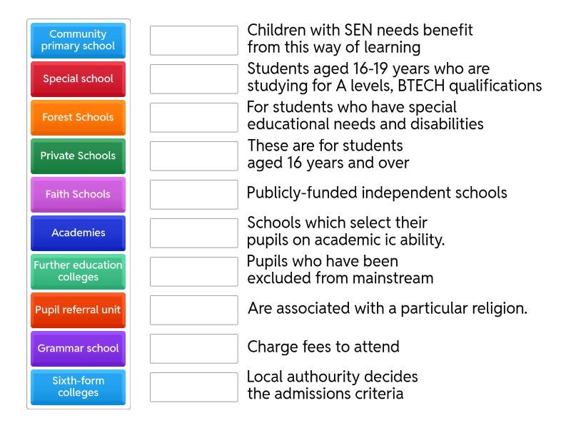 Grammar school - Schools which select their pupils on academic ic ability., Community primary school - Local authourity decides the admissions criteria, Academies - Publicly-funded independent schools, Faith Schools - Are associated with a particular religion., Private Schools - Charge fees to attend, Forest Schools - Children with SEN needs benefit from this way of learning, Further education colleges   - These are for students aged 16 years and over, Special school   - For students who have special educational needs and disabilities, Pupil referral unit - Pupils who have been excluded from mainstream, Sixth-form colleges - Students aged 16-19 years who are studying for A levels, BTECH qualifications,