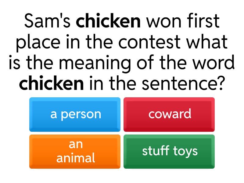 1) Sam's chicken won first place in the contest what is the meaning of the word chicken in the sentence? a) a person b) coward c) an animal d) stuff toys 2) Sam's chicken one first place in the contest. The word chicken in this sentence is a…. a) denotation b) connotation c) opinion d) mood 3) Sam was too chicken to enter the contest. The word chicken in this sentence is a… a) Denotation b) Connotation c) opinion d) mood 4) Sam was too chicken to enter the contest. The connotation of the word chicken in this sentence is … a) Negative b) Postive 5) Which statement has the most positive connotation ? a) He was very self-confident b) He was very egotistical c) He was very arrogant 6) Which sentence has the most negative connotation? a) We bought inexpensive souvenirs. b) We bought cheap souvenirs. c) We bought well-priced souvenirs.