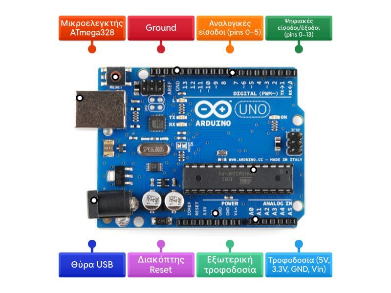 Τροφοδοσία (5V, 3.3V, GND, Vin), Ground, Αναλογικές είσοδοι (pins 0–5), Ψηφιακές είσοδοι/έξοδοι (pins 0–13), Διακόπτης Reset, Θύρα USB, Eξωτερική τροφοδοσία, Μικροελεγκτής ATmega328.