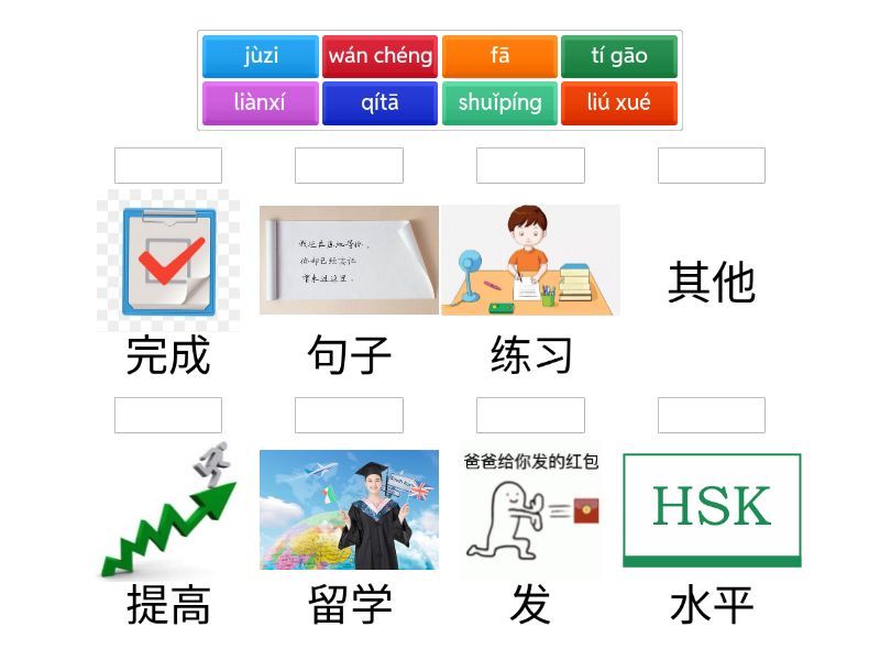 liú xué - 留学, shuǐpíng - 水平, tí gāo - 提高, liànxí - 练习, wán chéng - 完成, jùzi - 句子, qítā - 其他, fā - 发,