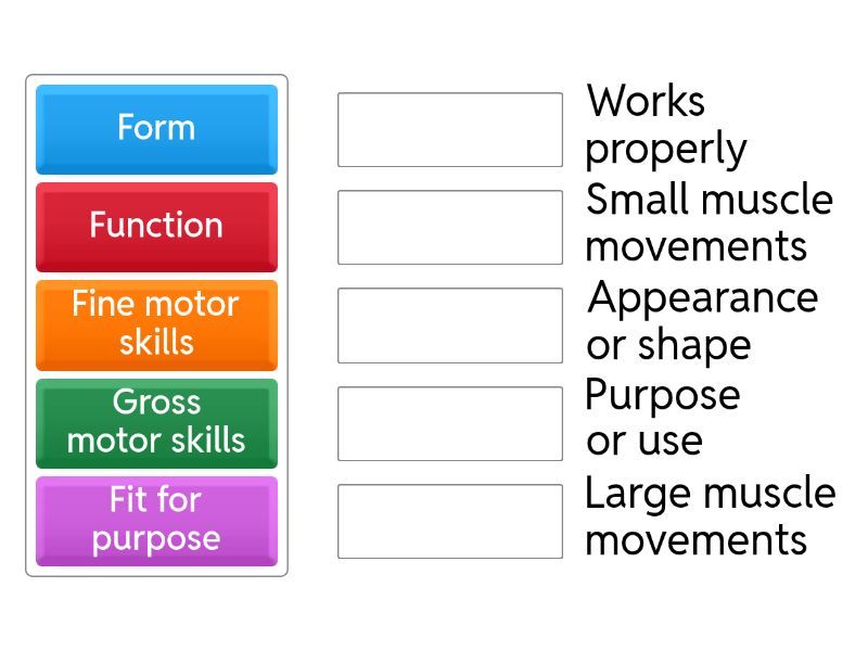 Form - Appearance or shape, Function - Purpose or use, Gross motor skills - Large muscle movements, Fine motor skills - Small muscle movements, Fit for purpose - Works properly,