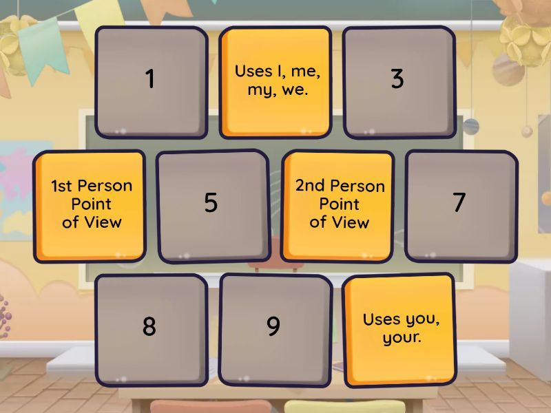 1st Person Point of View - Uses I, me, my, we., 2nd Person Point of View - Uses you, your., 3rd Person Point of View - Uses he, she, they, the characters’ names., 3rd POV Limited - Feelings of one character., 3rd POV Omniscient - Feelings of all characters.,