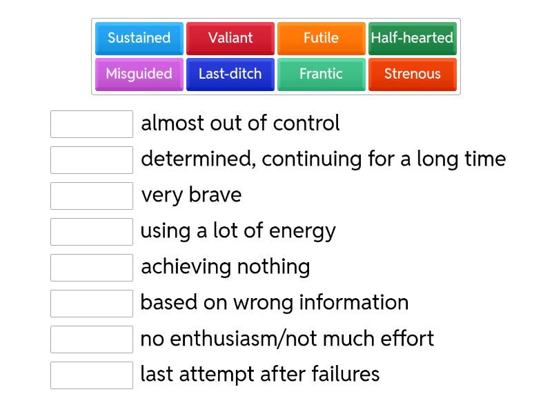 Valiant - very brave, Half-hearted - no enthusiasm/not much effort, Futile - achieving nothing, Sustained - determined, continuing for a long time, Misguided - based on wrong information, Last-ditch - last attempt after failures, Frantic - almost out of control, Strenous - using a lot of energy,