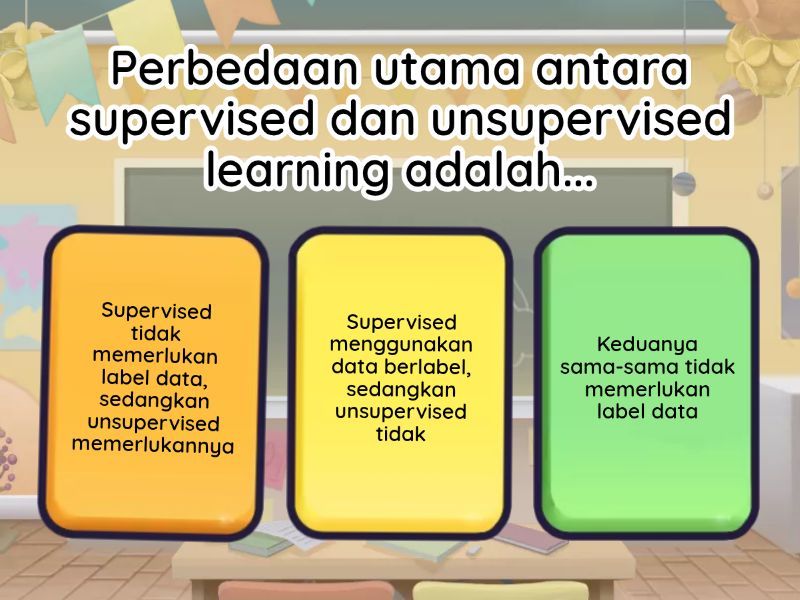 1) Perbedaan utama antara supervised dan unsupervised learning adalah... a) Supervised tidak memerlukan label data, sedangkan unsupervised memerlukannya b) Supervised menggunakan data berlabel, sedangkan unsupervised tidak c) Keduanya sama-sama tidak memerlukan label data 2) Teknik early stopping digunakan untuk.. a) Menghentikan pelatihan sebelum model mulai overfitting b) Meningkatkan jumlah epoch agar model lebih akurat c) Menambah bobot neuron secara acak 3) Dalam reinforcement learning, komponen utama yang memberikan umpan balik terhadap aksi agen disebut... a) Environment b) Policy c) Reward 4) Perbedaan utama antara Bayesian Network dan Markov Random Field adalah... a) Bayesian Network menggunakan graf tidak berarah, sedangkan MRF berarah b) Bayesian Network berarah dan merepresentasikan ketergantungan kausal c) Keduanya identik secara struktural namun berbeda algoritma inferensi 5) Mengapa logistic regression menggunakan fungsi sigmoid? a) Karena menghasilkan output kontinu b) Karena mengubah output menjadi probabilitas antara 0 dan 1 c) Karena mempercepat perhitungan gradien 6) Jika bobot awal jaringan saraf diinisialisasi terlalu besar, apa yang mungkin terjadi? a) Gradien menjadi terlalu kecil b) Aktivasi neuron bisa jenuh (saturated), menyebabkan vanishing gradient c) Model belajar lebih cepat dan akurat 7) Semakin besar area di bawah kurva ROC (AUC), maka... a) Performa model semakin buruk b) Model semakin baik dalam membedakan kelas positif dan negatif c) Model tidak dapat digunakan untuk klasifikasi 8) Metode boosting seperti AdaBoost bekerja dengan cara... a) Melatih beberapa model lemah secara berurutan dengan memperhatikan kesalahan model sebelumnya b) Melatih semua model secara paralel dan menggabungkan hasilnya c) Menghapus model lemah agar performa meningkat 9) Dalam Support Vector Machine, pemilihan kernel yang tidak sesuai dapat menyebabkan.. a) Model gagal menemukan hyperplane pemisah di ruang fitur b) Overfitting berkurang karena margin meningkat c) Model konvergen ke solusi global lebih cepat 10) Teorema PAC (Probably Approximately Correct) learning menjamin bahwa... a) Model pasti mencapai akurasi 100% pada data uji b) Dengan cukup banyak data, model akan mendekati fungsi target dengan probabilitas tinggi c) Model hanya bergantung pada kompleksitas arsitektur, bukan data