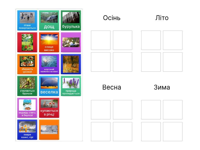 Осінь: , дощ, хмари важкі, сірі, збирають урожай, Літо: , веселка, сонце високо, купаються в річці, Весна: , природа прокидається, з'являються бруньки, птахи повертаються, Зима: , морозний малюнок на вікні, бурулька, ведмідь спить в берлозі,