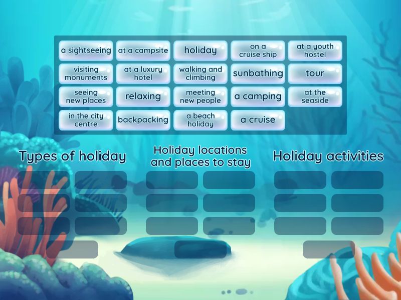 Types of holiday: a camping, holiday, a beach holiday, a sightseeing, tour, a cruise, backpacking, Holiday locations and places to stay: at a campsite, at a luxury hotel, on a cruise ship, at a youth hostel, in the city centre, at the seaside, Holiday activities: walking and climbing, meeting new people, sunbathing, relaxing, visiting monuments, seeing new places,