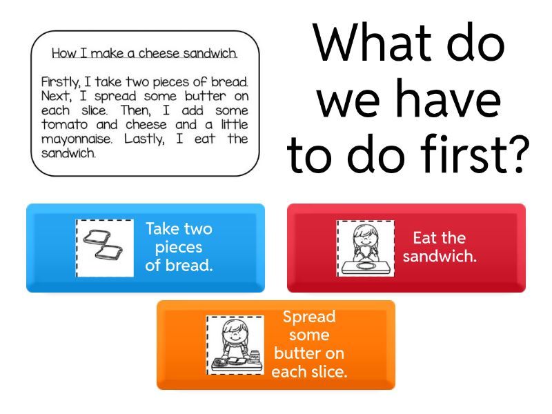 1) What do we have to do first? a) Take two pieces of bread. b) Eat the sandwich. c) Spread some butter on each slice.  2) What happens at the beginning of the story?  a) Sam puts on a green hat. b) Sam will take a nap on the mat. c) Sam is sad. 3) What happens at the end of the story? a) A dog was on my bed. b) It is just me in on my bed. c) A cat was on my bed.