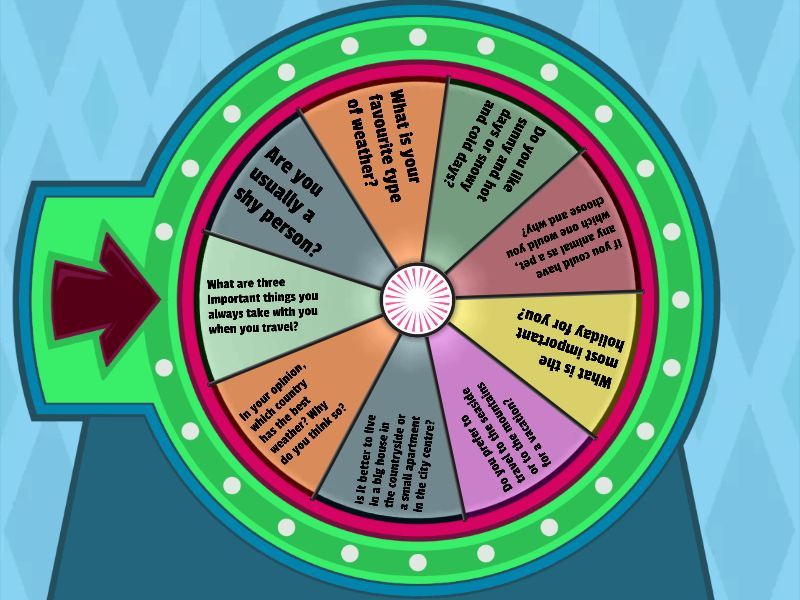 1) Are you usually a shy person? 2) What is your favourite type of weather? 3) Do you like sunny and hot days or snowy and cold days? 4) If you could have any animal as a pet, which one would you choose and why? 5) What is the most important holiday for you? 6) Do you prefer to travel to the seaside or to the mountains for a vacation? 7) Is it better to live in a big house in the countryside or a small apartment in the city centre? 8) In your opinion, which country has the best weather? Why do you think so? 9) What are three important things you always take with you when you travel?