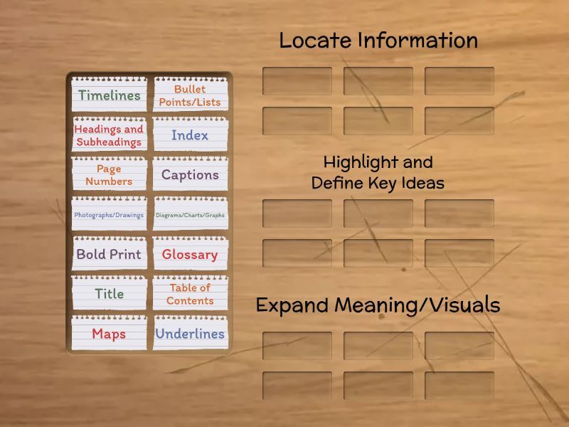 Locate Information: Table of Contents, Index, Headings and Subheadings, Title, Page Numbers, Bullet Points/Lists, Highlight and Define Key Ideas: Bold Print, Underlines, Glossary, Expand Meaning/Visuals: Photographs/Drawings, Captions, Diagrams/Charts/Graphs, Maps, Timelines,