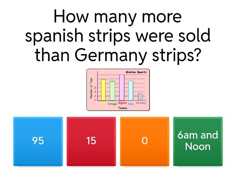 1) How many more spanish strips were sold than Germany strips? a) 95 b) 15 c) 0 d) 6am and Noon 2) What was the lowest temperature? a) England b) 99.5 oF c) 37 d) 22 3) How many people gave blood altogether? a) 22 b) 35 c) 12 d) 95 4) How many tents did The Tent store (Red) sell in July & August?  a) 15 b) 22 c) Neither, both sold 7100 tents d) 0 5) How many people liked Chilli Beef and Pork? a) Stir Fry b) 37 c) 95 d) 99.5 oF 6) At what 2 times was the temperature rising? a) 6am and Noon b) Stir Fry c) 22 d) Neither, both sold 7100 tents 7) How many tents did Tents for you (Green) sell in April?  a) 99.5 oF b) 35 c) 6am and Noon d) 12 8) Whose sales were lower overall? a) 22 b) England c) 12 d) Neither, both sold 7100 tents 9) How many people gave blood on Friday? a) 22 b) Neither, both sold 7100 tents c) 35 d) 99.5 oF 10) What was the least liked food with rice? a) Stir Fry b) 12 c) 37 d) England