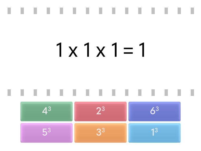 13 - 1 x 1 x 1 = 1, 23 - 2 x 2 x 2 = 8, 33 - 3 x 3 x 3 = 27, 43 - 4 x 4 x 4 = 64, 53 - 5 x 5 x 5 =125, 63 - 6 x 6 x 6 = 216,