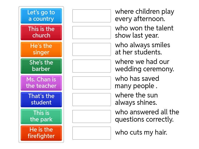 He’s the singer - who won the talent show last year., She's the barber - who cuts my hair., Let's go to a country - where the sun always shines., That’s the student - who answered all the questions correctly., This is the church - where we had our wedding ceremony., Ms. Chan is the teacher - who always smiles at her students., He is the firefighter - who has saved many people ., This is the park - where children play every afternoon.,