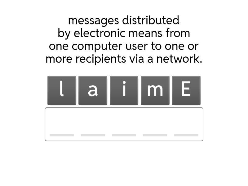 Email - messages distributed by electronic means from one computer user to one or more recipients via a network., Username - a unique name or identifier used to log in to a computer, website, or online service, Monitor - an electronic device with a screen used for display (as of television pictures or computer information, Tech - the application of scientific knowledge for practical purposes, especially involving computing and related fields., Device - a thing made or adapted for a particular purpose, especially a piece of mechanical or electronic equipment., Technology  - the application of scientific knowledge for practical purposes, especially in industry.,
