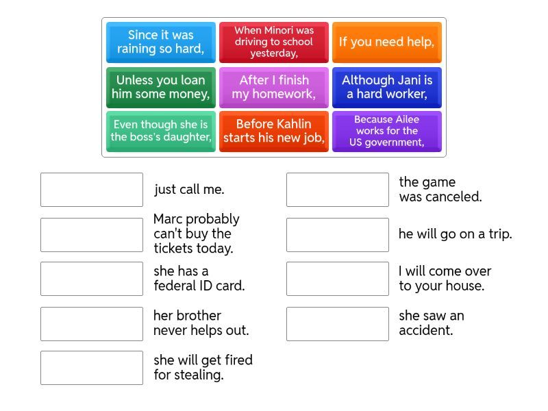 Since it was raining so hard, - the game was canceled., Although Jani is a hard worker, - her brother never helps out., When Minori was driving to school yesterday, - she saw an accident., Even though she is the boss’s daughter, - she will get fired for stealing., Because Ailee works for the US government, - she has a federal ID card., Unless you loan him some money, - Marc probably can't buy the tickets today., If you need help, - just call me., Before Kahlin starts his new job, - he will go on a trip., After I finish my homework, - I will come over to your house.,