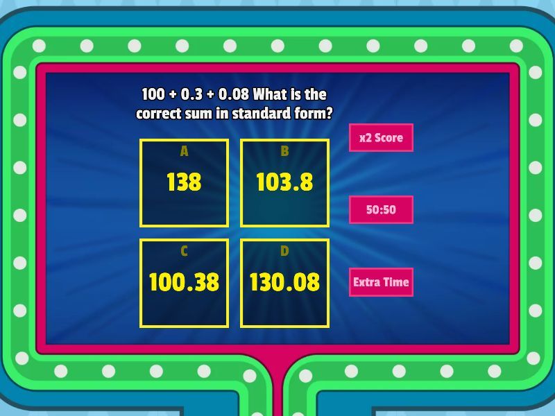 1) 100 + 0.3 + 0.08 What is the correct sum in standard form? a) 138 b) 103.8 c) 100.38 d) 130.08 2) Which expressions are equivalent to 745.9 a) 74 tens + 5 ones + 9 tenths b) 745 hundreds + 9 tens c) 74 hundreds + 5 ones + 9 tenths d) 7 hundreds + 45 tens + 9 tenths 3) Which number is rounded to the nearest hundredths correctly? 357.137 a) 357.13 b) 357.137 c) 357.14 d) 357.147 4) Subtract: 9.1 - 0.52 a) 8.58 b) 9.058 c) 9.42 d) 8.42 5) What's the missing Addend? 0.43 + _____ = 5.53 a) 5.00 b) 4.8 c) 5.01 d) 5.1 6) Write the decimals in increasing order: 21.018, 21.105, 21.003, 21.888, 21.357 a) 21.888, 21.357, 21.105, 21.018, 21.003 b) 21.003, 21.888, 21.357, 21.105, 21.018 c) 21.003, 21.35, 21.105, 21.018, 21.888 d) 21.003, 21.018, 21.105, 21.357, 21.888 7) There are about 795 houses in this region. The average family size is 6 people. There are about __________ people living in the region. a) 4800 b) 5500 c) 4700 d) 5000 8) If a call received on a Sunday is 12.45 minutes longer than the average time, 9.38 min., how long is that call? a) 22.73 b) 21.93 c) 21.83 d) 22.83