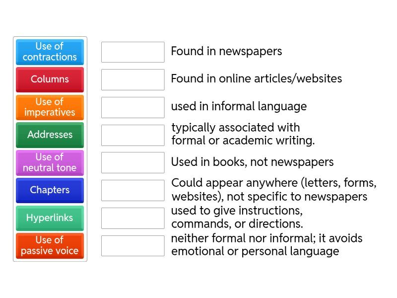 Use of imperatives - used to give instructions, commands, or directions., Use of contractions - used in informal language, Use of passive voice - typically associated with formal or academic writing., Use of neutral tone - neither formal nor informal; it avoids emotional or personal language, Hyperlinks - Found in online articles/websites, Columns - Found in newspapers, Chapters - Used in books, not newspapers, Addresses - Could appear anywhere (letters, forms, websites), not specific to newspapers,