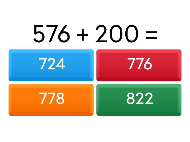 1) 576 + 200 = a) 724 b) 776 c) 778 d) 822 2) 494 + 200 = a) 396 b) 866 c) 986 d) 694 3) 774 + 200 = a) 619 b) 890 c) 960 d) 974 4) 449 + 200 = a) 649 b) 695 c) 731 d) 749 5) 436 + 400 = a) 808 b) 818 c) 836 d) 852 6) 118 + 700 = a) 617 b) 763 c) 818 d) 909 7) 469 + 100 = a) 478 b) 569 c) 592 d) 685 8) 352 + 500 = a) 784 b) 814 c) 842 d) 852 9) 725 + 100 = a) 821 b) 825 c) 881 d) 898 10) 551 + 300 = a) 593 b) 851 c) 860 d) 918