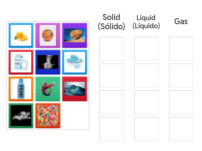 Solid (Sólido): , , , , Liquid (Líquido): , , , , Gas: , , ,