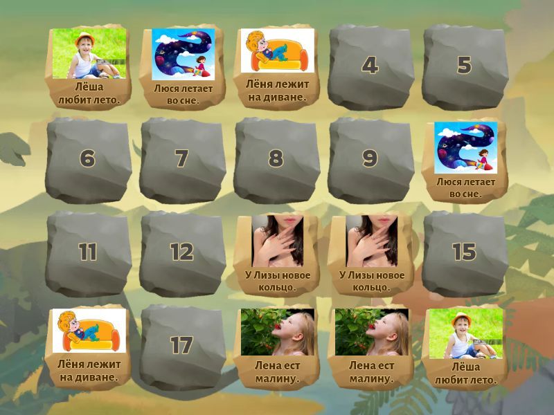 Лена ест малину., У Лизы новое кольцо., Лёня лежит на диване., Люся летает во сне., Лёша любит лето., Полина гуляет в лесу., У Лёвы болит колено., Лера поливает цветы., Улитка сидит на листочке., Лев лежит на земле.,