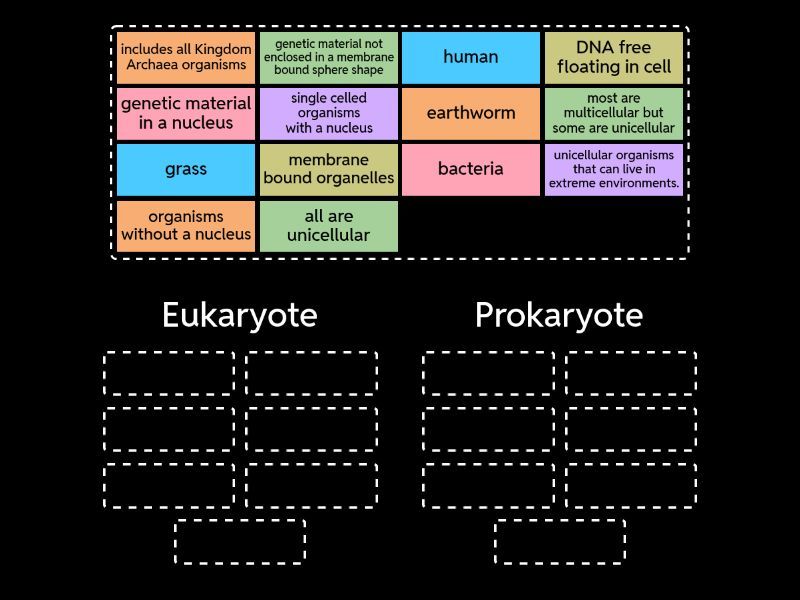 Eukaryote: human, grass, membrane bound organelles, genetic material in a nucleus, most are multicellular but some are unicellular, earthworm, single celled organisms with a nucleus, Prokaryote: bacteria, all are unicellular, organisms without a nucleus, DNA free floating in cell, includes all Kingdom Archaea organisms, unicellular organisms that can live in extreme environments., genetic material not enclosed in a membrane bound sphere shape,