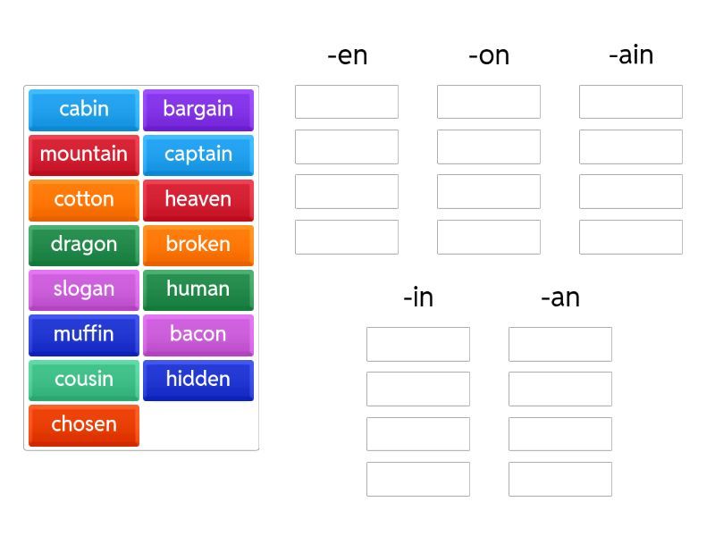 -en: broken, hidden, heaven, chosen, -on: dragon, cotton, bacon, -ain: mountain, captain, bargain, -in: cousin, cabin, muffin, -an: human, slogan,