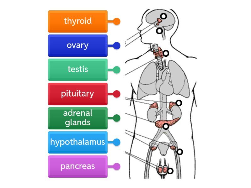 hypothalamus, pituitary, thyroid, adrenal glands, pancreas, ovary, testis.