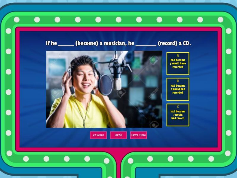 1) If he ______ (become) a musician, he ________ (record) a CD. a) had become / would have recorded b) had became / would had recorded c) had become / would had record 2) If she _______________ (go) to art school, she __________ (become) a painter. a) had went / would had become b) had gone / would have become c) had gon/ would have became 3) If I __________ (be) born in a different country, I __________ (learn) to speak a different language. a) had been / would had learned b) had be/ would have learn c) had been / would have learned 4) If he __________ (not take) the job, he _________ (go) travelling. a) haven't taken / would have went b) hadn't taken/ would have gone c) hadn't took / would have gone 5) If we ___________ (not go) to the party, we _______________ (not/meet) them. a) haven't go / would had met b) hadn't gone / would have meet c) hadn't gone/ wouldn't have met 6) He __________ (be) happier if he ____________ (stay) at home. a) would have be / had stayed b) would have been / had stayed c) would had been / had stood 7) If they ________________ (try) harder they _______________________ (finish) by now. a) tried / would had finished b) have tried / would have finish c) had tried / would have finished 8) If we __________________ (eat) that seafood we ____________________ (get) sick. a) didn't have eaten / would have got sick b) hadn't eaten / wouldn't have got sick c) haven't eaten / wouldn't have got sick 9) It ____________________ (be) better if you __________________ (buy) that old car. a) would have been / hadn't bought b) would had been / hadn't bought c) would have been/ hadn't buyed 10) If I _______________________ (write) to you sooner, you _________________ (feel) so lonely. a) had writed / wouldn't have b) had written / wouldn't have c) had writing / would have