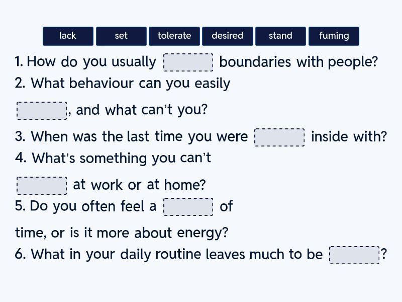 1. How do you usually ____ boundaries with people? 2. What behaviour can you easily ____, and what can’t you? 3. When was the last time you were ____ inside with? 4. What’s something you can’t ____ at work or at home? 5. Do you often feel a ____ of time, or is it more about energy? 6. What in your daily routine leaves much to be ____? 7. What in your life could be ____ right now? 8. How often do you need to ____ a class or a meeting? 9. Have you ever tried to break a ____ circle in your habits? 10. What’s the hardest problem to ____ in your current schedule? 11. How do you usually make ____ - quickly or slowly? 12. Is there a ____ in your family, or do you share it equally?