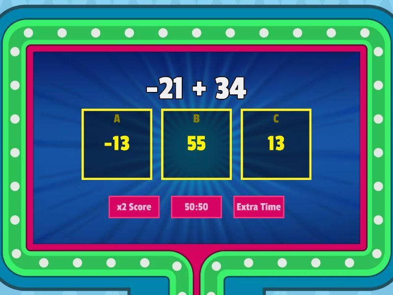 1) -21 + 34 a) -13 b) 55 c) 13 2) -15 + (-15) a) -30 b) 0 c) 30 3) 4 + (-12) a) -16 b) -8 c) 8 4) 41 + (-41) a) 0 b) 82 c) -82 5) -23 + 32 a) 9 b) -9 c) 55 d) -55 6) 2.45 + (-1.8) a) -0.65 b) 0.65 c) 4.25 d) -4.25 7) 85 + (-28.005)  a) -56.995 b) 56.995 8) -4 + (-9) a) -5 b) 5 c) 13 d) -13 9) -17 + 20 a) 3 b) -3 c) -37 10) 18.25 + (-50) a) -31.25 b) 31.25 c) -31.75 d) 31.75 11) -5.38 + 7.9 a) 13.28 b) -13.28 c) 2.52 d) -2.52