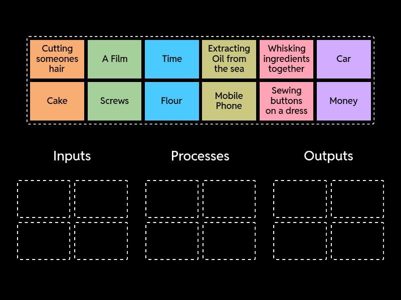 Inputs: Flour, Screws, Money, Time, Processes: Extracting Oil from the sea, Whisking ingredients together, Cutting someones hair, Sewing buttons on a dress, Outputs: Cake, A Film, Mobile Phone, Car,