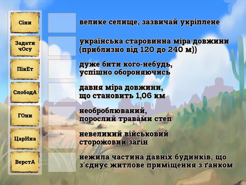 РедУт - багатокутне польове укріплення, здатне до самостійної оборони, ВерстА - давня міра довжини, що становить 1,06 км, КурІнь - великий міцний будинок, де жили козаки, що об'єднувалися в одну війському групу, яку теж називали куренем, Сіни - нежила частина давніх будинків, що з'єднує житлове приміщення з ґанком, Комора - невелике приміщення в житловому будинку, де тримають їжу, хатні речі тощо, Стайня - спеціальна будівля, де тримають коней, ПікЕт - невеликий військовий сторожовий загін, ГОни - українська старовинна міра довжини (приблизно від 120 до 240 м)), ЦарИна - необроблюваний, порослий травами степ, ОсавУл - козацький старшина, командир, СлободА - велике селище, зазвичай укріплене , ПалАнка - невелике укріплене козацьке село, Кіш - Запорізька Січ, Задати чОсу - дуже бити кого-небудь, успішно обороняючись,