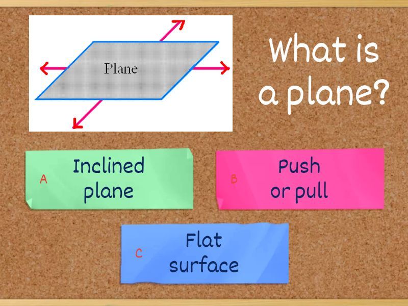 1) What is work? a) Force moves object b) Device makes work easier c) Flat surface 2) What is a force? a) Inclined plane b) Push or pull c) Flat surface 3) What is power? a) Device makes work easier b) Push or pull c) Amount of Work in an amount of time 4) What is a contact force? a) Inclined plane b) Push or pull touching c) Flat surface 5) What is a machine? a) Push or pull b) Flat surface c) Device makes work easier 6) What is a plane? a) Flat surface b) Inclined plane c) Push or pull 7) What is a wedge? a) Flat surface b) simple machine used to split, lift, or hold objects c) Device makes work easier 8) What is a screw? a) Flat surface b) Threaded Inclined plane cylinder c) Push or pull 9) What is a lever? a) Inclined plane apart b) Flat surface c) A Rigid bar resting on a folcrum 10) What is a wheel and axle? a) Flat surface b) Two circular objects c) Inclined plane cylinder 11) What is a pulley? a) Rope in groove b) Flat surface c) Inclined plane apart