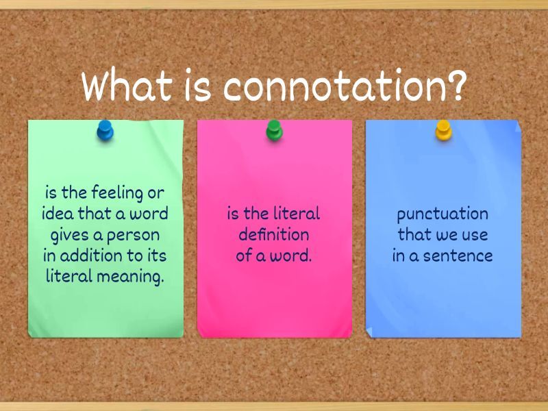 1) What is connotation? a) is the feeling or idea that a word gives a person in addition to its literal meaning. b) is the literal definition of a word. c) punctuation that we use in a sentence 2) What is denotation? a) is the literal definition of a word. b) punctuation that we use in a sentence c) is the feeling or idea that a word gives a person in addition to its literal meaning. 3) Which is an example of connotation? a) Blue b) Rat c) Dentist 4) Which is an example of denotation? a) Blue b) Unique c) Dentist 5) Which is an example of POSITIVE connotation? a) go-getter b) stingy c) stubborn 6) Which is an example of NEGATIVE connotation? a) steadfast b) thrifty c) stubborn 7) Which word is the POSITIVE connotation in the sentence?:  "My new neighbor is a mature woman" a) new b) woman c) mature 8) which word is a NEGATIVE connotation in the sentence?" My new neighbor is an strange woman" a) new b) neighbor c) woman d) strange 9) The teacher’s kingdom include thirty-seven smart and intelligent pupils and a conducive classroom. a) connotation b) denotation 10) A fire of unknown cause ate the thirty village houses. a) connotation b) denotation 11) We saw a tiger when we visited the zoo last week. a) connotation b) denotation 12) Her first singing performance served as the dawn of her career. a) connotation b) denotation 13) Volunteers were evacuating people trapped under the debris when the rescue team arrived. a) connotation b) denotation 14) At this stage of your life, you must be picky about what you eat. a) connotation b) denotation 15) did you enjoy this ? a) yes. b) no. c) it was bad and i hated it.