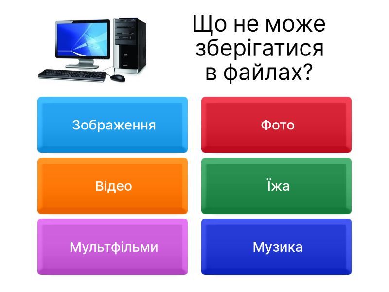 1) Що не може зберігатися в файлах? a) Зображення b) Фото c) Відео d) Їжа e) Мультфільми f) Музика 2) У програмі PowerPoint файл має розширення? a) pptx b) docx c) doc d) mp3 3) Для надання файлам імені існує таке правило: a) можна додавати символи ", ( ?- b) не можна додавати символи \ * / : ? ” < > | c) можна писати все 4) Файли розміщюються в ... a) Папці на диску b) Книжці c) Папковому дереві 5) Обери не правильно підписаний файл. a) Мій край.pptx b) **Світлини**.jpg c) Інформатика.docx d) Приклади+задачі.txt 6) Який пристрій для зберігання інформації вже не використовують? a) b) c) d)