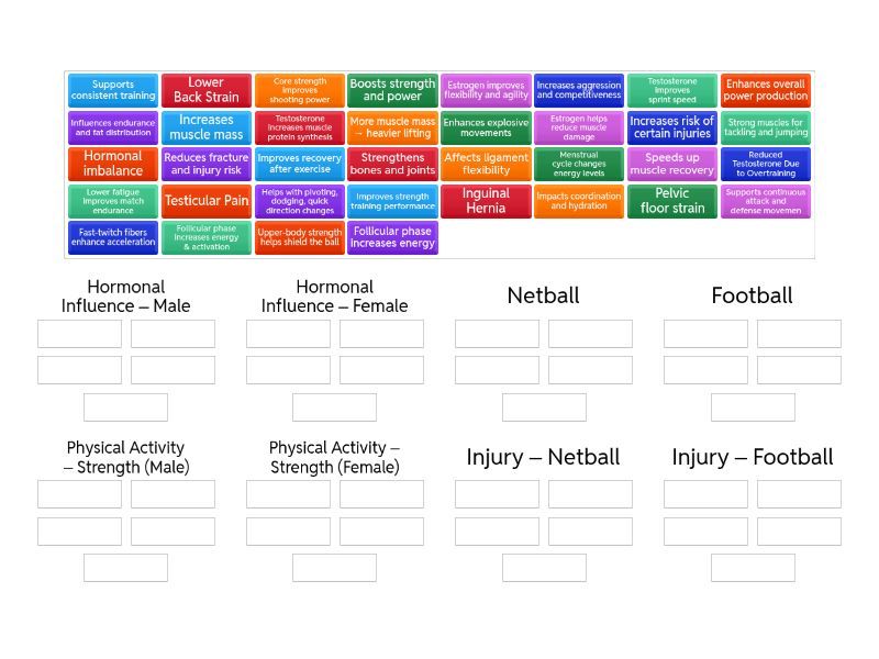 Hormonal Influence – Male: Increases muscle mass, Boosts strength and power, Enhances explosive movements, Improves recovery after exercise, Increases aggression and competitiveness, Hormonal Influence – Female: Affects ligament flexibility, Influences endurance and fat distribution, Menstrual cycle changes energy levels, Impacts coordination and hydration, Increases risk of certain injuries, Netball: Estrogen improves flexibility and agility, Helps with pivoting, dodging, quick direction changes, Follicular phase increases energy, Lower fatigue improves match endurance, Supports continuous attack and defense movemen, Football: Testosterone improves sprint speed, Fast-twitch fibers enhance acceleration, Strong muscles for tackling and jumping, Core strength improves shooting power, Upper-body strength helps shield the ball, Physical Activity – Strength (Male): Testosterone increases muscle protein synthesis, More muscle mass → heavier lifting, Strengthens bones and joints, Reduces fracture and injury risk, Enhances overall power production, Physical Activity – Strength (Female): Estrogen helps reduce muscle damage, Speeds up muscle recovery, Follicular phase increases energy & activation, Improves strength training performance, Supports consistent training, Injury – Netball: Lower Back Strain, Hormonal imbalance, Pelvic floor strain, Injury – Football: Inguinal Hernia, Testicular Pain, Reduced Testosterone Due to Overtraining,