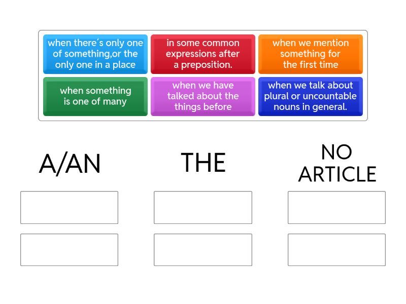 A/AN: when something is one of many, when we mention something for the first time, THE: when there´s only one of something,or the only one in a place, when we have talked about the things before, NO ARTICLE: when we talk about plural or uncountable nouns in general., in some common expressions after a preposition.,