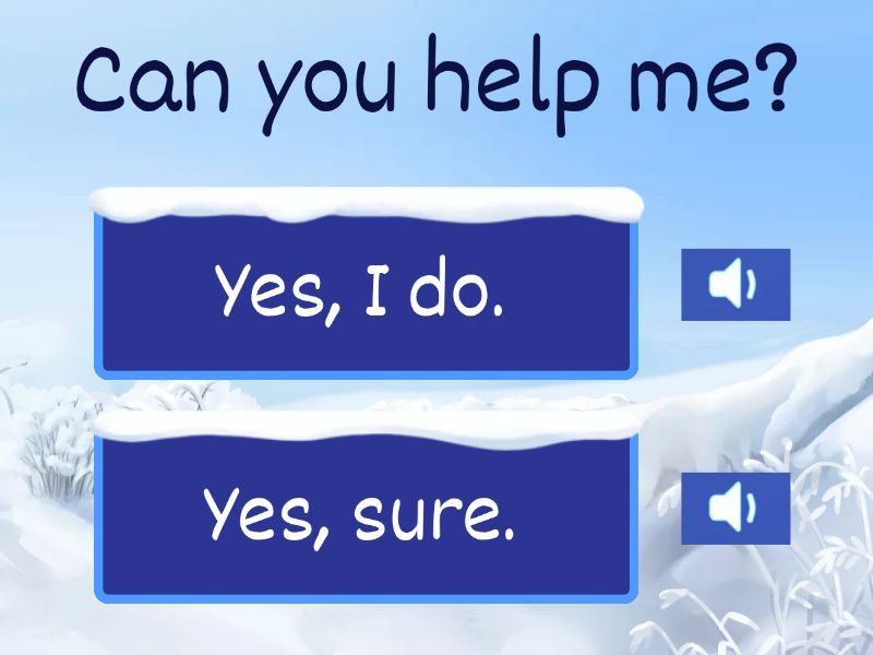 1) Can you help me? a) Yes, I do. b) Yes, sure. 2) - Hi! ... a) What's up? b) Bye! 3) Where is my coat? a) It's over there. b) Hang on! 4) Give me my hoodie, please. a) What's up? b) Here you are. 5) ... , what are these? a) Hang on. b) They're my shoes. 6) Can you help me? a) Sure. b) Hi. 7) I look for my trousers. a) What's up? b) Here you are. 8) Where're my new jacket? a) Sure. b) It's over there. 9) I look for a clothes shop. a) It's over there. b) What's up? 10) Hang on! Is it my hat? a) Yes, it's my hat. b) Yes, here you are. 11) Here you are! a) Thanks! b) Hang on! 12) What's up? a) Thanks. I'm OK. b) Over there!