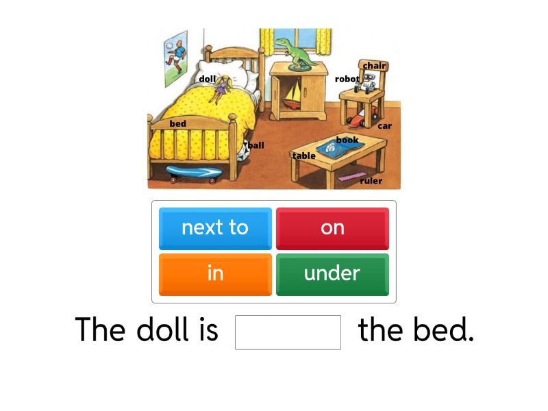 The doll is ____ the bed. The ____ is under the bed. The ____ is ____ the table. The ruler is ____ the ____. The car ____ ____ the ____. The robot ____ ____ the ____.