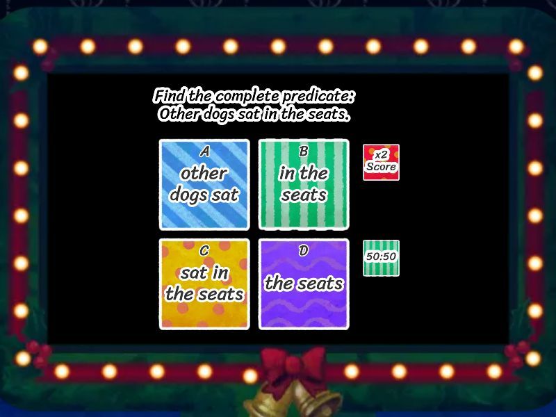 1) Find the complete subject: The shiny, black cat yawned. a) black cat b) The shiny, black cat c) black cat yawned d) yawned 2) Find the complete predicate: He spoke rudely to Coraline. a) He b) He spoke c) spoke rudely d) spoke rudely to Coraline 3) Find the complete subject: His big, green eyes glinted. a) His b) big, green eyes c) green eyes glinted d) His big, green eyes 4) Find the complete subject: The cat is not the “other” cat. a) The cat b) is not c) the "other" cat d) is not the "other" cat e) The cat is 5) Find the complete predicate: The creepy old house looked the same. a) house b) looked c) looked the same d) The creepy old house 6) Find the complete subject: The creepy old house looked the same. a) house b) looked c) looked the same d) The creepy old house 7) Find the complete predicate: The red and blue lights quickly flashed around the door. a) flashed b) flashed around the door c) quickly flashed around the door d) The red and blue lights quickly 8) Find the complete subject: The red and blue lights quickly flashed around the door. a) The red and blue lights b) lights c) quickly flashed around the door d) The red and blue lights quickly 9) Find the complete predicate: The black velvet curtain silently opened. a) opened b) silently opened c) The black velvet curtain d) velvet curtain silently 10) Find the complete subject: The black velvet curtain silently opened. a) opened b) silently opened c) The black velvet curtain d) velvet curtain silently 11) Find the complete predicate: Coraline quietly watched the show. a) Coraline quietly b) Coraline quietly watched c) quietly watched d) quietly watched the show 12) Find the complete subject: Coraline quietly watched the show. a) Coraline quietly b) Coraline c) quietly watched d) quietly watched the show 13) Find the complete predicate: Other dogs sat in the seats. a) in the seats b) sat in the seats c) the seats d) other dogs sat 14) Find the complete subject: Other dogs sat in the seats. a) other dogs b) sat in the seats c) the seats d) other dogs sat 15) Find the complete predicate: The Scottie dog with the flashlight asked for Coraline’s ticket. a) asked b) asked for Coraline's ticket c) The Scottie dog d) with the flashlight 16) Find the complete subject: The Scottie dog with the flashlight asked for Coraline’s ticket. a) The Scottie dog with the flashlight b) asked for Coraline's ticket c) The Scottie dog d) with the flashlight