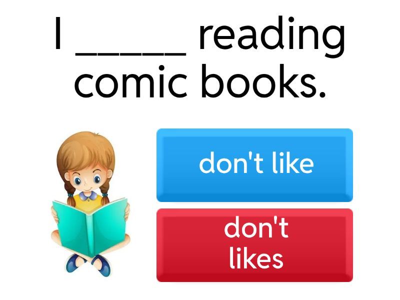 1) I _____ reading comic books. a) don't like b) don't likes 2) She _____ swimming. a) doesn't likes b) likes 3) He ______ walking in the park. a) don't like b) doesn't like 4) We ______ walking in the forest. a) like b) doesn't like 5) They _____ riding bikes together. a) don't like b) doesn't likes 6) You ____ playing board games. a) like b) doesn't likes 7) She ____ talking. a) don't like b) doesn't like 8) He ______ skiing. a) like b) likes 9) I _____skating. a) don't like b) doesn't likes 10) I _____ sweeping my room. a) don't like b) don't likes 11) He _______ doing homework. a) don't like b) doesn't like 12) We _________ spiders. a) don't like b) likes 13) She ___________ dancing and singing. a) likes b) like 14) He _____________ washing the dishes. a) like b) doesn't like 15) I ___________ pineapples and mangoes. a) like b) likes 16) Does Mom like cats? a) Yes, she doesn't. b) No, she doesn't. 17) What does your brother like? a) He like riding the bike. b) He likes riding the bike. 18) What does Grandma like? a) She like the beautiful dress. b) She likes the beautiful dress. 19) What do they like? a) They like hamburgers. b) They likes burgers. 20) Which animal does Grandpa like? a) He likes lizards. b) He like lizards.