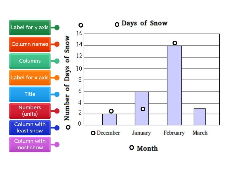 Title , Numbers (units), Label for x axis, Label for y axis, Column with most snow, Column with least snow, Columns, Column names.