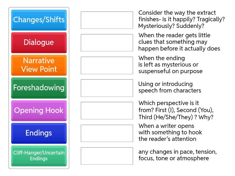 Opening Hook - When a writer opens with something to hook the reader's attention, Changes/Shifts - any changes in pace, tension, focus, tone or atmosphere, Dialogue - Using or introducing speech from characters, Narrative View Point - Which perspective is it from? First (I), Second (You), Third (He/She/They) ? Why?, Endings - Consider the way the extract finishes- is it happily? Tragically? Mysteriously? Suddenly?, Cliff-Hanger/Uncertain Endings - When the ending is left as mysterious or suspenseful on purpose, Order of events - Literally the order that events happen: Is it chronological (time order)? Circular? Chaotic?, Foreshadowing - When the reader gets little clues that something may happen before it actually does, Sentence variations - Varying the length/structure of sentences for effect (shorter = quicker pace/powerful, longer = descriptive or rambling), Repetition - Repeating key words or phrases or ideas to emphasise something, Contrasts/Juxtapositions - Having one idea and then the opposite thing happens , Anti-Climax - building up our hopes/excitement and then letting it down, Climax - The most intense moment of the scene - all the suspense builds to this,