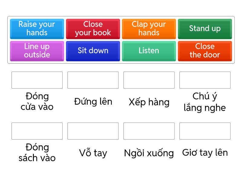 Open your book - Mở sách ra, Read - Đọc, Write - Viết, Sit down - Ngồi xuống, Stand up - Đứng lên, Close your book - Đóng sách vào, Clap your hands - Vỗ tay, Keep quiet - Giữ im lặng, Open the door - Mở cửa ra, Close the door - Đóng cửa vào, Fold your arms - Khoanh tay lại, Raise your hands - Giơ tay lên, Submit your book - Nộp sách vở, Listen - Chú ý lắng nghe, Line up outside - Xếp hàng, Repeat after me - Nhắc lại theo thầy/cô,