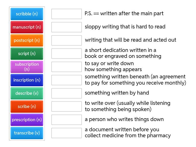 describe (v) - to say or write down how something appears, inscription (n) - a short dedication written in a book or engraved on something, manuscript (n) - something written by hand , postscript (n) - P.S. == written after the main part, prescription (n) - a document written before you collect medicine from the pharmacy, scribble (n) - sloppy writing that is hard to read, scribe (n) - a person who writes things down, script (n) - writing that will be read and acted out, subscription (n) - something written beneath (an agreement to pay for something you receive monthly), transcribe (v) - to write over (usually while listening to something being spoken),