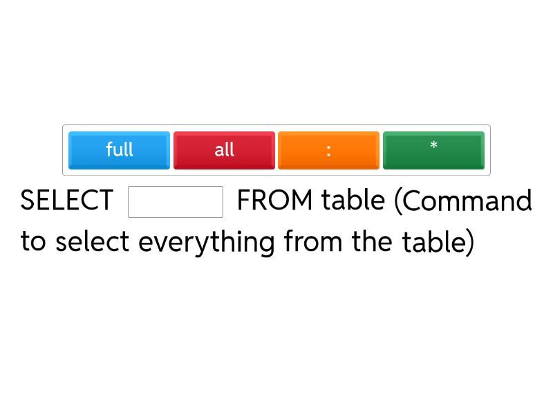 SELECT ____ FROM table (Command to select everything from the table) SELECT * FROM table ____ age > 3 (Command to introduce a condition) ____ age ____ 5 (Operator "Different from x") SELECT ____ FROM table (Command to show only section "age" from the table) ____ ____ 1 AND 100 (Operator "Between x and y") ____ ____(1,2,3,5) (Operator "In this list") SELECT age____ name FROM table (Used to separate the sections showed) ____ ____(1,2,3,6) (Operator "Not in this list") ____ name = ____ (Used to indicate a empty string (only with space)) SELECT * FROM table1____ table2 (Used to separate the tables showed)