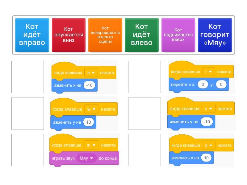 Кот поднимается вверх, Кот опускается вниз, Кот идёт вправо, Кот идёт влево, Кот возвращается в центр сцены, Кот говорит «Мяу»,