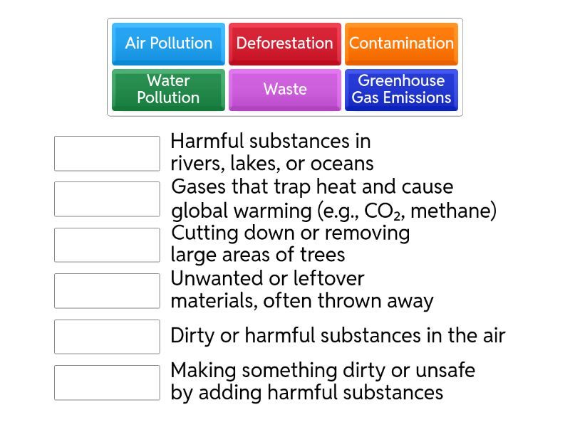 Deforestation - Cutting down or removing large areas of trees, Contamination - Making something dirty or unsafe by adding harmful substances, Waste - Unwanted or leftover materials, often thrown away, Air Pollution - Dirty or harmful substances in the air, Water Pollution - Harmful substances in rivers, lakes, or oceans, Greenhouse Gas Emissions - Gases that trap heat and cause global warming (e.g., CO₂, methane),