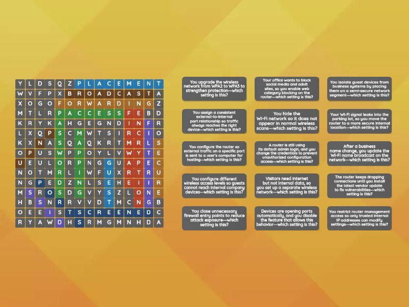 passwords - A router is still using its default admin login, and you change the credentials to prevent unauthorized configuration access—which setting is this?, filtering - Your office wants to block social media and adult sites, so you enable web category blocking on the router—which setting is this?, firmware - The router keeps dropping connections until you install the latest vendor update to fix vulnerabilities—which setting is this?, placement - Your Wi-Fi signal leaks into the parking lot, so you move the router to a more secure internal location—which setting is this?, upnp - Devices are opening ports automatically, and you disable the feature that allows this behavior—which setting is this?, screened - You isolate guest devices from business systems by placing them on a semi-secure network segment—which setting is this?, secure - You restrict router management access so only trusted internal IP addresses can modify settings—which setting is this?, access - You configure different wireless access levels so guests cannot reach internal company devices—which setting is this?, ssid - After a business name change, you update the Wi-Fi name broadcast on the network—which setting is this?, encryption - You upgrade the wireless network from WPA2 to WPA3 to strengthen protection—which setting is this?, guest - Visitors need internet but not internal data, so you set up a separate wireless network—which setting is this?, broadcast - You hide the Wi-Fi network so it does not appear in normal wireless scans—which setting is this?, ports - You close unnecessary firewall entry points to reduce attack exposure—which setting is this?, forwarding - You configure the router so external traffic on a specific port is sent to a user’s computer for hosting—which setting is this?, mapping - You assign a consistent external-to-internal port relationship so traffic always reaches the right device—which setting is this?,