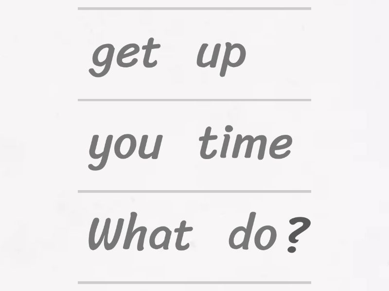 What time do you get up?, When do you usually go to bed?, Do you go to the gym?, Does he study at school?, What do you do in the morning?, Does he eat meat?, What time does he eat breakfast?, Does she eat dinner at home?, Do you study English at home?, When does she go to bed?, What time do you start school?, What time does she have breakfast?, Does she go to the gym?, What does he do in the morning?, When does he speak English?,