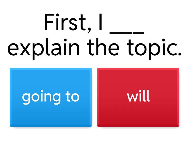 1) First, I ___ explain the topic. a) going to b) will 2) I ___ show you the photo now. a) going to b) will 3) I think the sound is low. I ___ speak louder. a) going to b) will 4) After that, I ___ talk about my results. a) going to b) will 5) At the end, you ___ see the project close up. a) going to b) will 6) Don’t worry, I ___ help you understand. a) going to b) will 7) Today I ___ talk about my country. a) going to b) will 8) I ___ repeat that for you. a) going to b) will